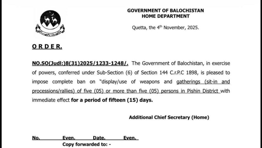 The Balochistan government has announced the enforcement of Section 144 in Pishin district for the next 15 days due to security concerns. The Home Department of Balochistan has issued a notification stating that the order will remain in effect in Pishin until November 20.